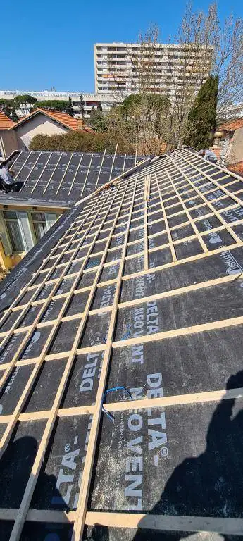 Termisud Couvertures vous propose la réfection complète d’une toiture en tuiles plates de Marseille avec un écran sous toiture HPV (Humidité, pluie et vent) à Toulon dans le var 83.