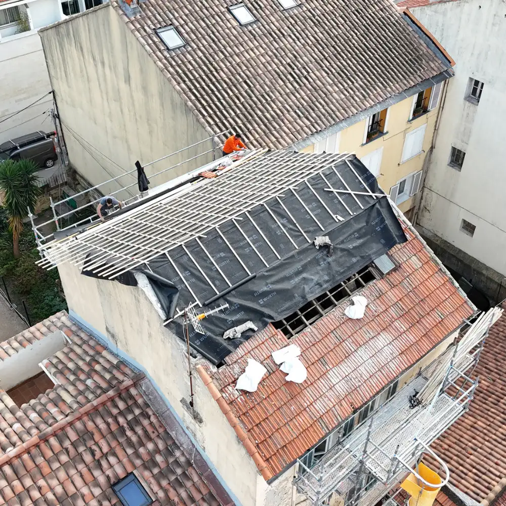 En tant que couvreur toiture Toulon, nous déposons la couverture existante, vérifions les supports et remettons en place une toiture saine. Cette méthode permet de supprimer durablement les risques de fuite, sans transformation lourde.