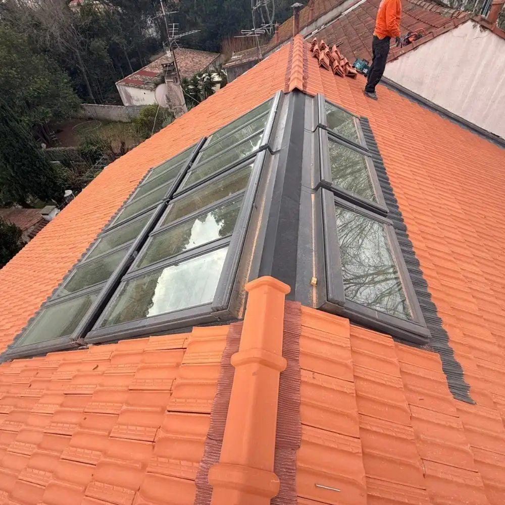 C'est l'étape clé qui demande le plus de précision. Notre couvreur Toulon procède à la dépose des tuiles sur la zone ciblée, à la découpe maîtrisée de la charpente avec renforcement des chevrons encadrants (chevêtre), puis au positionnement et au scellement du cadre du Vélux. Le tablier d'étanchéité est ensuite posé avec soin autour de l'encadrement, en respectant les recouvrements et les relevés prescrits par le DTU 40.35. Chaque jonction est contrôlée pour garantir une étanchéité toiture Toulon absolument irréprochable, quelle que soit l'intensité des pluies méditerranéennes.